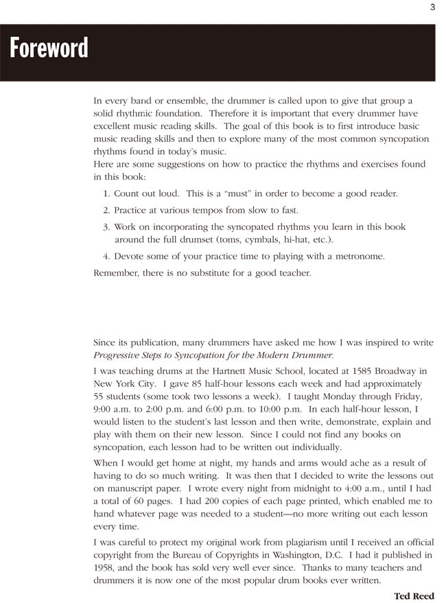 Voted second on Modern Drummer's list of 25 Greatest Drum Books in 1993, Progressive Steps to Syncopation for the Modern Drummer is one of the most versatile and practical works ever written for drums. Created exclusively to address syncopation, it has earned its place as a standard tool for teaching beginning drummers syncopation and strengthening reading skills. This book includes many accented eighths, dotted eighths and sixteenths, eighth-note triplets and sixteenth notes for extended solos. In addition, teachers can develop many of their own examples from it.
