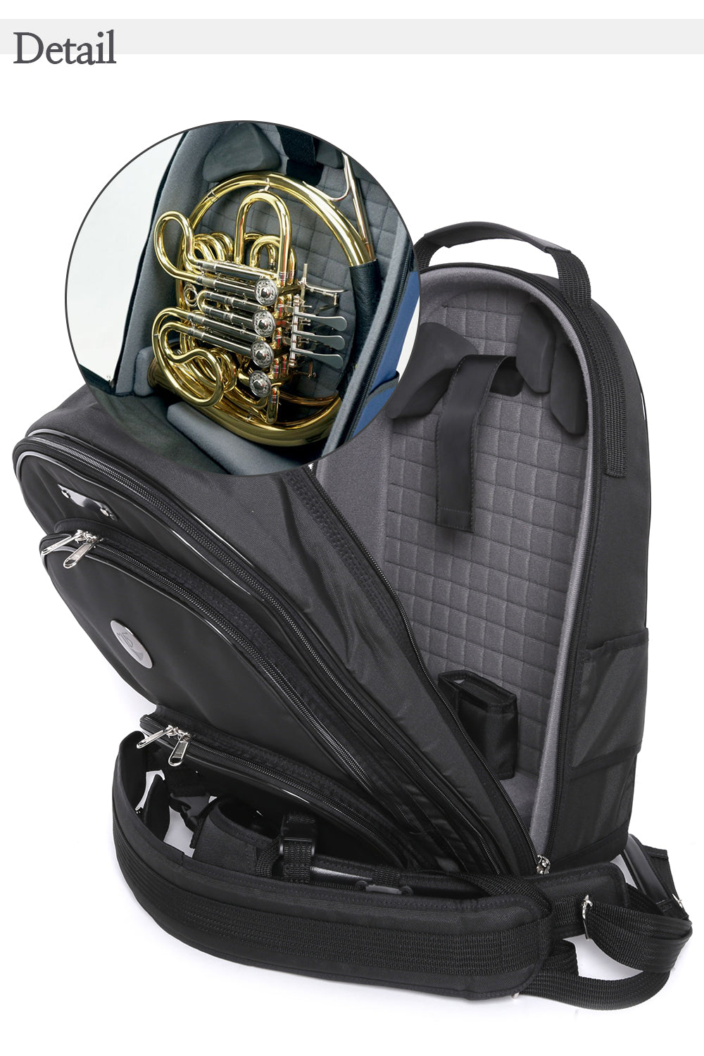 The backpack bag with room for horn model MB fits one screw bell french horn.