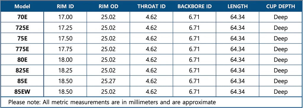 All Laskey E Series Horn Mouthpiece cup sizes are made with a standard throat size of .182”/(“14”)/4.62mm.