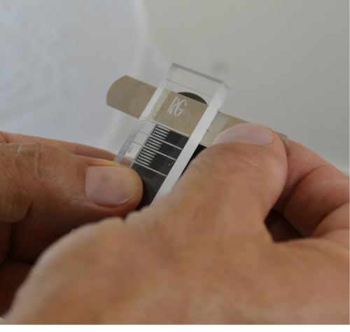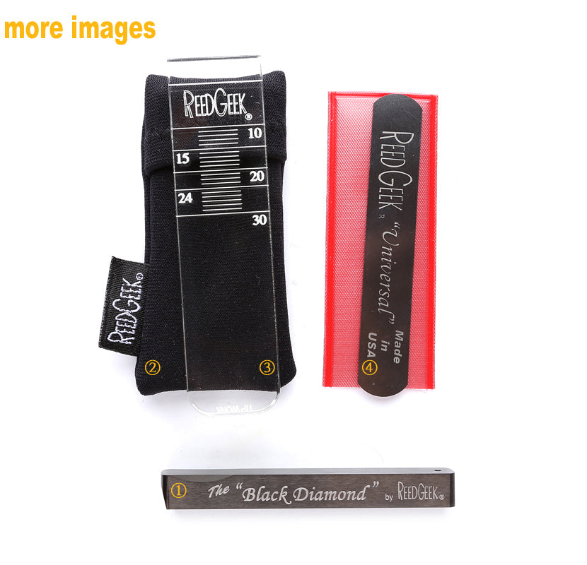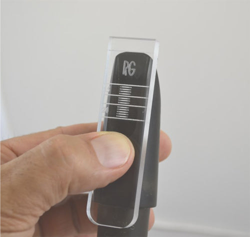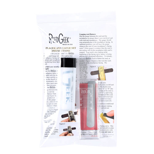 The Plaque Set allows you to quickly and easily determine mouthpiece facing lengths and gauge the exact position for most effective reed adjustment and balancing. The topside of the plaque (marked tip) can also be used to support the reed while using your ReedGeek to make precise adjustments to the reed’s tip. Instructions are included.