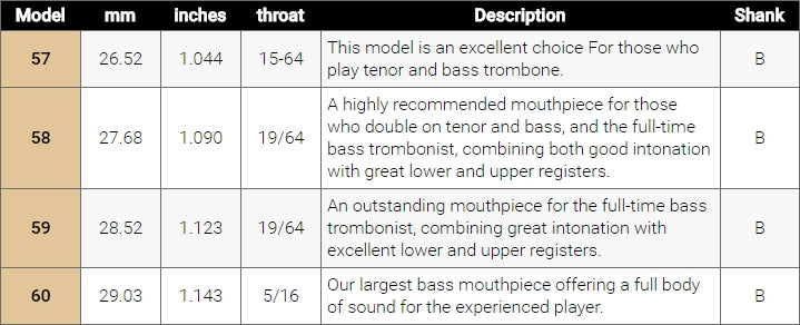58 | 27.68 | 1.090 | 19/64 (.2969″) | A highly recommended mouthpiece for those who double on tenor and bass, and the full-time bass trombonist, combining both good intonation with great lower and upper registers. | B |