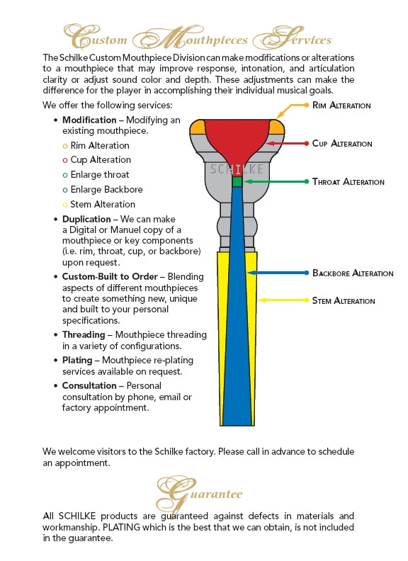 Based in design on several of our best selling rim sizes, these Concert Cornet Series mouthpieces offer a deeper traditional British style cup, which is ‘V’ shaped. Available in 6E4, 13E4, 14E4, 15E, 16E4, 17E, 18E and 20E rim sizes, these models offer a warm, rich, true cornet sound with a balanced resistance while maintaining articulation clarity.